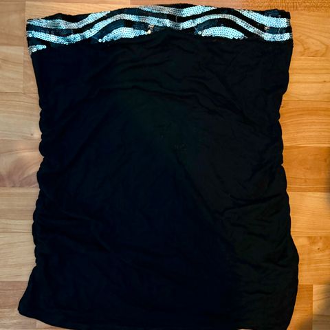 Topp i 100% viskose. Strikk nederst og blankt stoff over skuldrene og øverst på ryggen. Fremstår som ny.