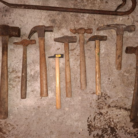 Snekkerhammere med stålskaft kr. 90.-. Med treskaft kr. 75.-. HAMMER MED BRUNT SKAFT OG DEN SMÅ MED BLÅTT SKAFT, ER SOLGT.