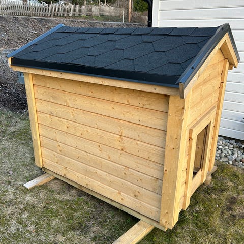Hønsehuset er laget av furu av høy kvalitet, og er derfor sterkt og holdbart. Det grønne, vanntette stoffet på taket holder regnet vekk, og skaper et varmt og komfortabelt hvilested inne i hønsehuset.