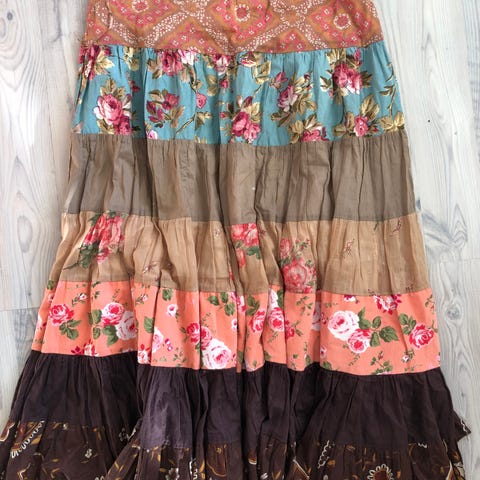 Nytt ubrukt maxiskjørt i fargene brunt og turkis fra VeroModa. Str. M. Strikk i livet bak. Stretch. Livvidde 76 cm. Lengde 96 cm. Glidelås i siden. Røyk- og dyrefritt. Ny med tags. Selger kr.399,-. Pris er satt.