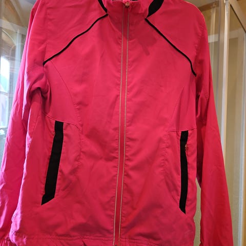 Nesten ny treningsjakke/løpejakke/lettvektsjakke fra Asics. Med hette, to lommer og hull til tommel. Kan evt. pakkes inn til en liten sekk. Velig lett. Kanskje er litt små i størrelse. str xs. kr 300