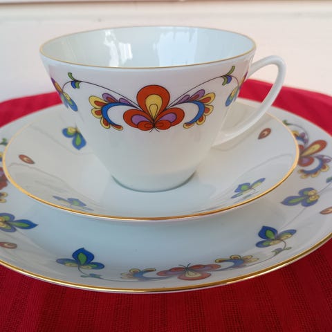 Bondemønster. Modell 8. PP. 6 stk kuvert med asjetter diam. 15,6 cm. 1960-61. 6 stk underskåler diam. 13,4 cm. 1961. 6 kopper 1961-62. Alle deler er feilfri og som nye. Dette er det originale tynne porselen. Pris pr. kuvert