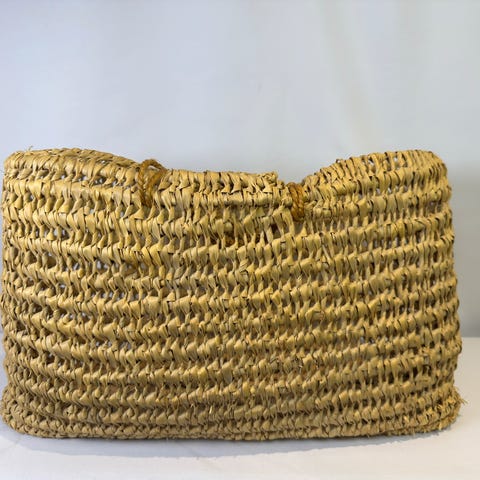 Bag i bomull med håndtak i lær. Brukt til å ha håndklær i på badet.