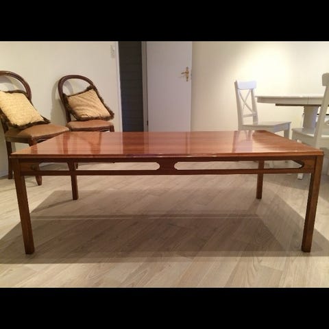 Flott ovalt salongbord fra Rasmus Solberg i Ski. Veldig pent bord og i tipp topp stand. Bordet er brunt med sjatteringer.
