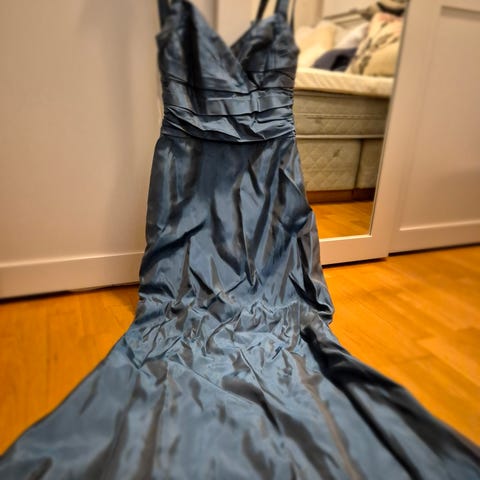 Nydelig lang kjole i blank sateng med tynne stropper. Flott innsvinget i midjen og med fine flatterende draperinger på brystet. Kun brukt en gang.