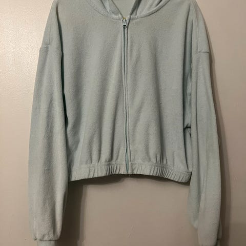 Turkis Hettejakke med for i hette. Str 152, 11-12 år. Strammebånd i hette. Glidelås og lommer i front. Myk 100 % bomull. Brukt kun en gang og fremstår som ny. Lengde fra nakke og ned 60 cm. Omkrets 92 cm. Armlengde 50 cm. Sendes mot porto.