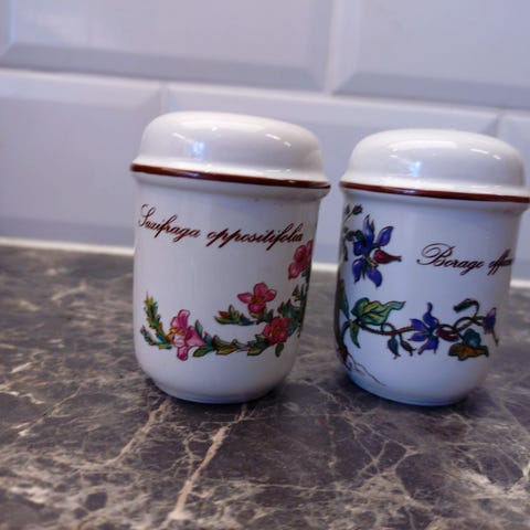 Gammelt og fint kryddersett fra Villeroy & Boch, nummerert, med tilhørende koselig trehylle selges. Brukt og noe skader, se bilder. Må hentes.