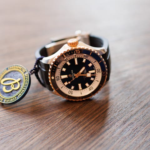 Klokken kommer i en vanntett kevlarkoffert og leveres med to remmer – én eksklusiv mørk brun lærrem og én sort spesiallaget nylonrem som du kan bruke i vann.
