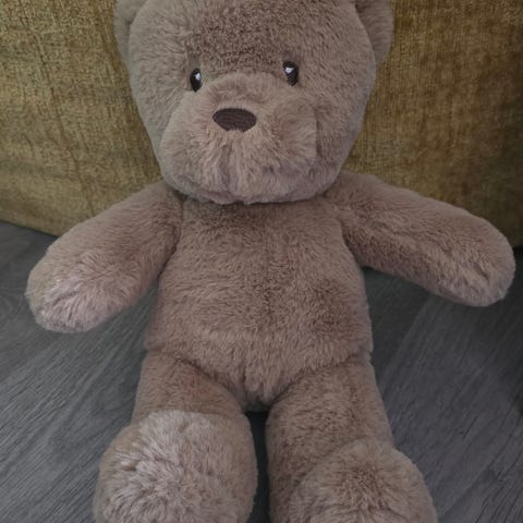 Liten blå bamse fra Keel Toys (Ca 20 cm lang). Det står "Hug me". under beina.