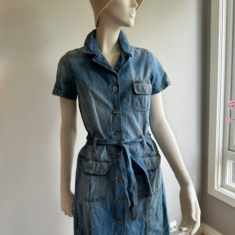 Selger en vintage skjorte kjole med fargen blå batikk (ujevn blåfarge). Lommer har ulik fargetone på den ene siden vs den andre siden. Fine knapper. Antar str S/M. Ser at det mest sannsynlig har vært hull under armen som er sydd. Behagelig stoff, mykt.