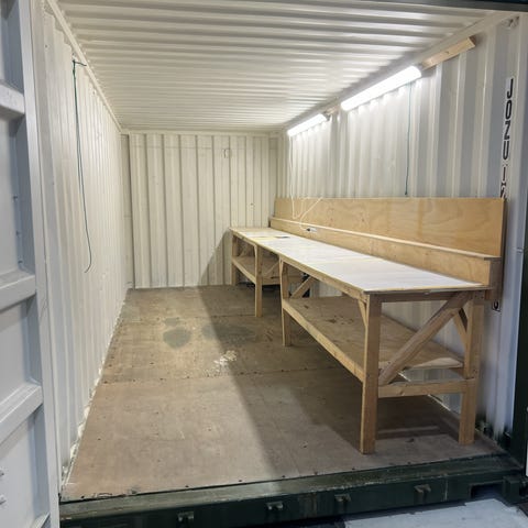 Komplett med isolering og isolert personaldør, strøm inn og flere uttak. Ledlys i tak, og spotlight over benk.