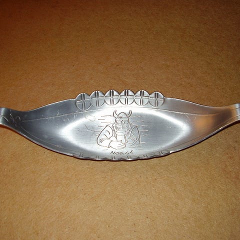 Metallfat med et motiv av Gjøvik kirke. 28,5 cm langt, 17,5 cm bredt.