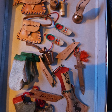 En del del stedssouvenirer med miniatyrgjenstander i kopper.