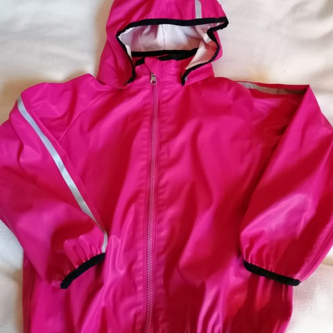 Regnjakke fra Stormberg i str. 3 - romslig på størrelsen (vi har brukt med 5 år). Med refleks. Med hette.