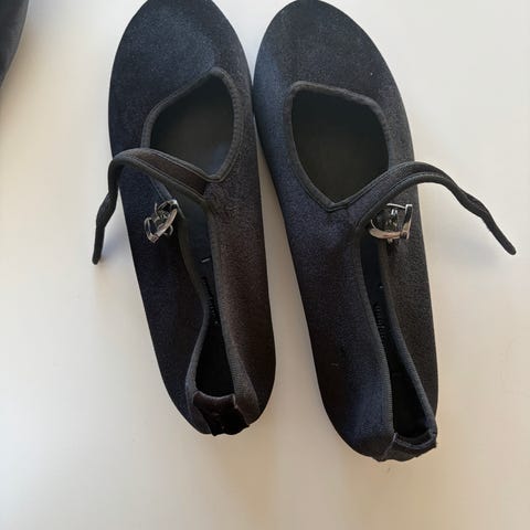 Skoene er litt gjennomsiktige (gråaktig/røyk farge), med sort mønster og sort/gull pynt.