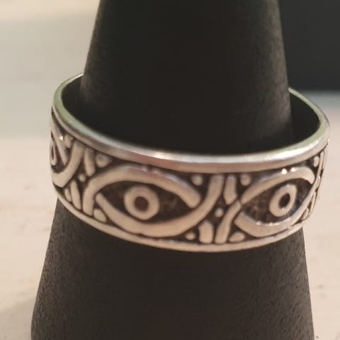 Stålring med svart emalje. Merket som str 21. Diametr inne 2,2cm, bredde 0,8cm, vekt 6g.