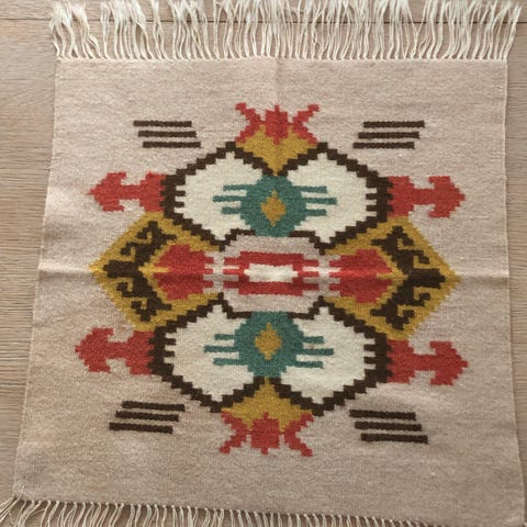 2) Smal avlang håndheklet brikke - L 26 cm og B ca. 10 cm: kr. 75,-.