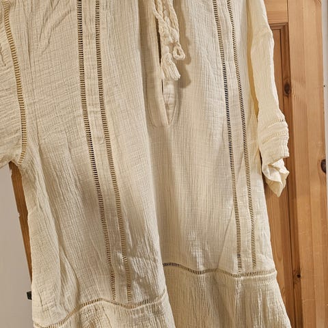 Gjennomsiktig overst. Underkjole. Strikk i livet.