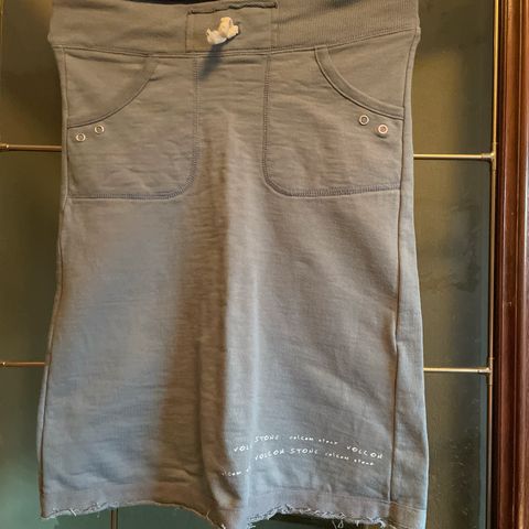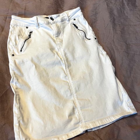 Skjørtet er fint og slett i virkeligheten, men ikke lett å glatte helt ut på bildene! Stripete skjørt som nytt, lite brukt. Størrelse 40, lengde fra topp linning og ned 63 cm.med hvitt belte. 2 lommer foran og 2 lommer bak. Glidelås som i bukser foran, splitt bak.