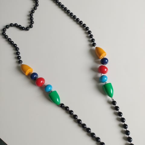 Flott nytt vintage kjede med perlemor, tre, shell etc. Ca 32cm langt med rundt anheng 5.2 cm. Den ene ringen er veldig liten ( kanskje en større ring mangler?) det fungerer m låsen uansett og jeg har også prøvd og kan ta det over hodet uten å åpne. Selger det derfor billig for 200.- ferdig prutet. Se bilder og min profil for flere kjeder + mye annet.