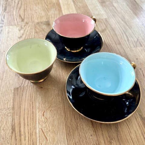 Figgjo flint espresso sett.. 5 stk i forskjellige farger, med gull innside. Fra 50 tallet. Strøkent. Selges samlet 4000,-