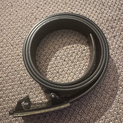 Sort belte, godt brukt men mye belte igjen. Litt frynsete/nuppete i kantene men ellers helt.