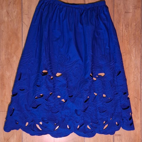 Pent skjørt med strech, laget av bomull. Formsydd, normal i str, har noe bruksmerker, selges derfor billig. 55cm lengde og 83 cm midje.