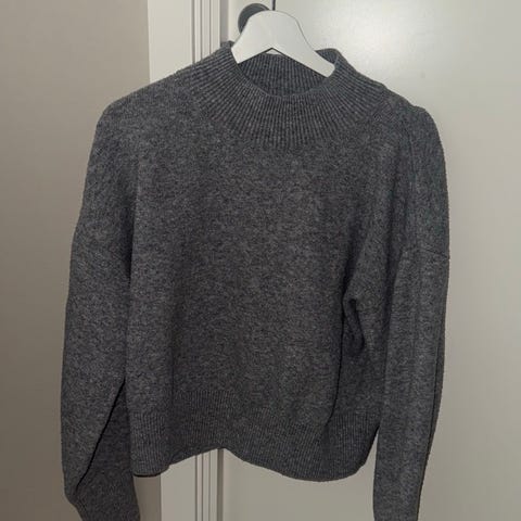Grå, strikket genser med trompetermer / vide ermer. Nesten ikke brukt, fremstår som ny.