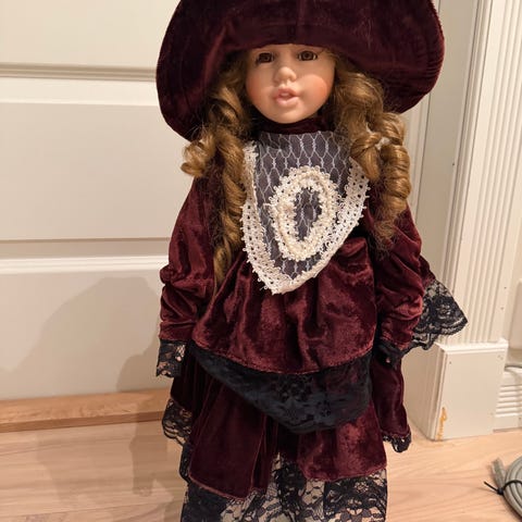 Vakker porselendukke med paraply og brodert kjole. Den har støtte under kjolen og står pent oppstilt på hylle. Selges svært rimelig.