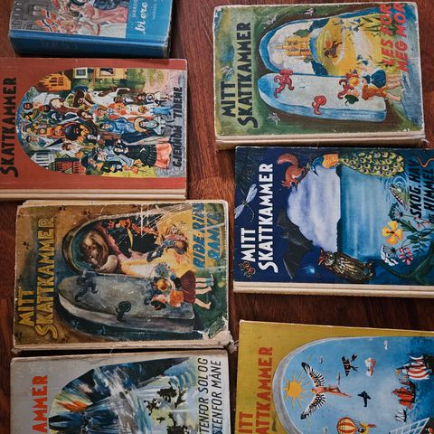Jeg selger noen eksemplarer av eventyrbøkene MITT SKATTKAMMER fra 1959 til hbo kr 50,- pr stk. Bøkene er hele, men noe slitt på utsiden naturlig nok, ellers hele som bildene viser. Jeg har følgende bøker igjen:
