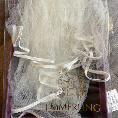 Brudekjole med blonde detaljer og litt bling, langt slep, Knytting i rygg. Følger med langt slør med blonde detaljer. Ny pris kjole 24000, ny pris slør 5000.
