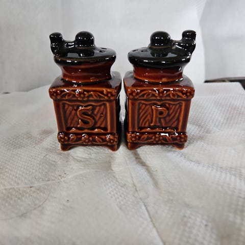 I keramikk, disse er håndmalt. Med lokk. Fra Spania. Står Sal for salt og Azucar for sukker.