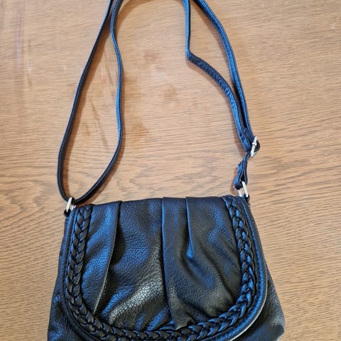 Fin sort veske med strass pynt på låsen. Vesken er i god stand. Skulderstropp kan reguleres.