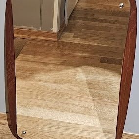 Kjempefint retrospeil med brun plastramme, produsert av Finnmirror (nr. 296) på 70-tallet.