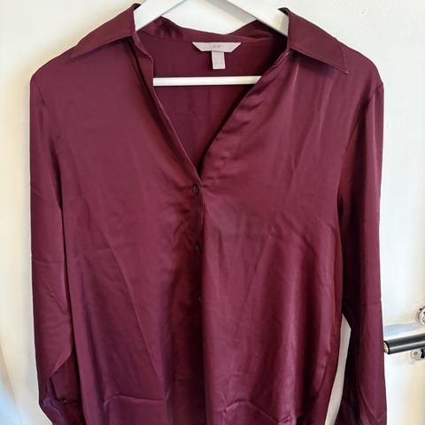 Bluse i burgunder, foran er det 100% viskose og bakdel 100% polyester