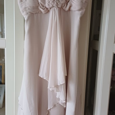Floyd kjole str 14, (ca 38/40) champagnefarget med brunlig broderi. Båndet rundt midjen ser rosa ut på bilde,men har samme farge som kjolen.