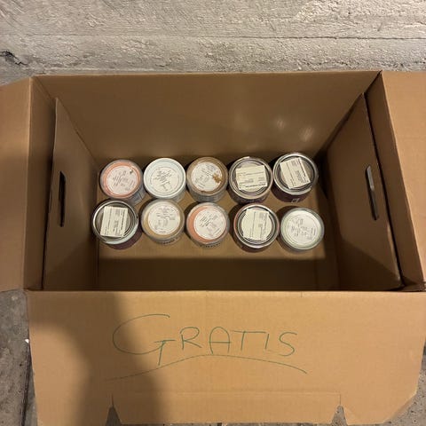 Grunnet ekstrem ubesluttsomhet sitter jeg med svært mange prøvebokser maling som kanskje noen andre kan få glede av. Varierende hvor mye maling det er igjen; noen er nesten helt fulle mens andre er det brukt litt mer av. Nok i alle til at man får testa ut fargen ihvertfall.