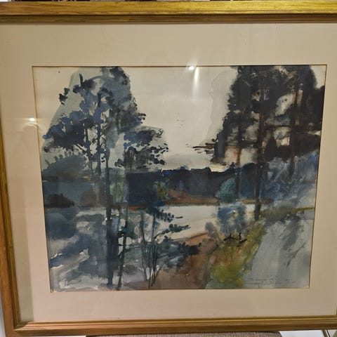 2 akvareller hhv. 59x51cm og 51x43 motiv fra Jæren og Stavanger. Det største fra Jæren kr 400, det andre kr 300. Begge samlet kr.600. Må hentes.