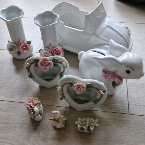 Porselen pynte/brukstallerkener - vintage/retro - 1 stor 26 cm - 4 mindre - diam.19 cm - pene. Frakt kr. 69,- inkl. sporing og forsikring! Sender over hele landet!