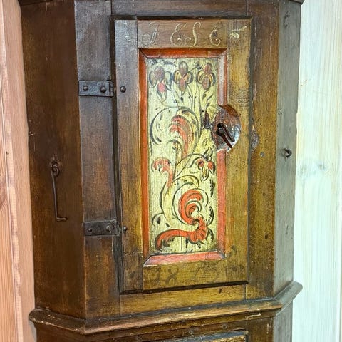 Sjarmerende hengeskap i god stand med dekorativt motiv.