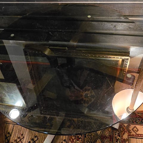 Bord med glassplate, diameter 69 cm og høyde 49 cm selges for kr. 600,- Bør ses og må hentes.