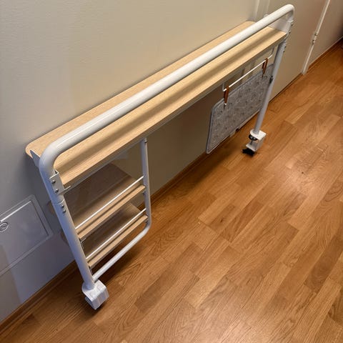 Praktisk og solid støttestativ til toalett til salgs. Kan vippes opp. Har montert på ein brakett for feste til toalettrullholder. Monteringsskruer følger med.