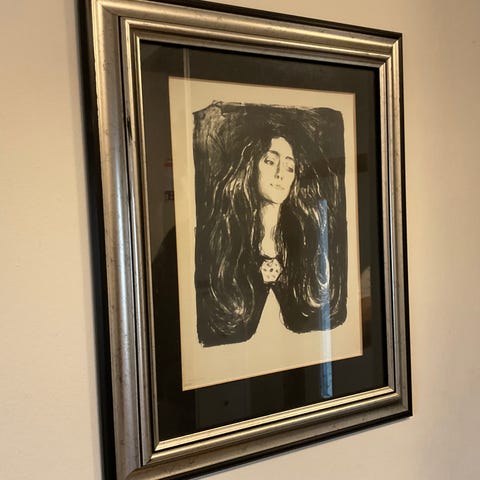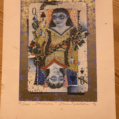 Flott tresnitt av Burger Siem. Mål: 65x 39. Som kunstner var hun representert med en rekke utsmykninger og verk i offentlige samlinger. Eksempelvis Norsk Kulturråd, Oslo kommunes kunstsamlinger og Norges bank m. Flere. En rekke separat utstillinger i inn og utland, som USA , Danmark.