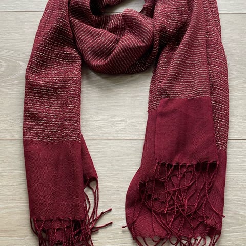 Strikket skjerf i rillestrikk, på langs i to nydelige burgunderfarger.