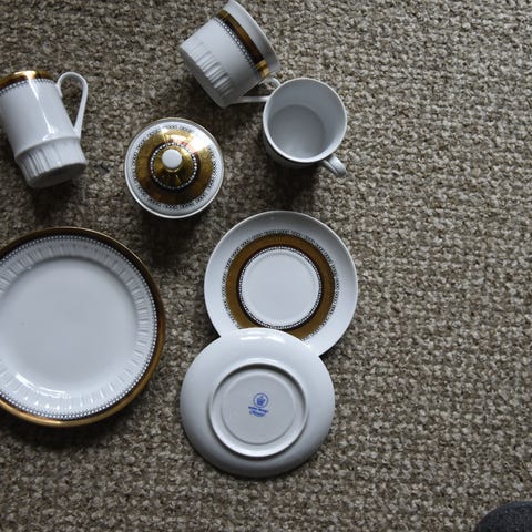 Kjempefint kaffeservise fra Kahla i porselen med gullkant, pent brukt.
