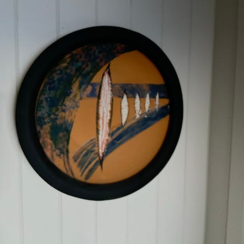 Kunst til å ha på et bord eller til å henge opp,- fritt valg. Nydelige blågrønne farger.