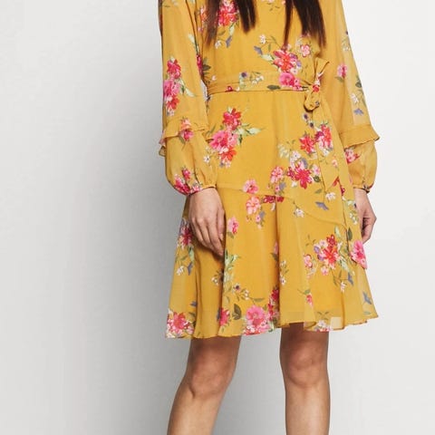 Blomstret omslagskjole i en varm oransje bunnfarge, med lange ermer og liten kappe nederst. Lengde til knærne. Oppleves som normal i størrelsen.