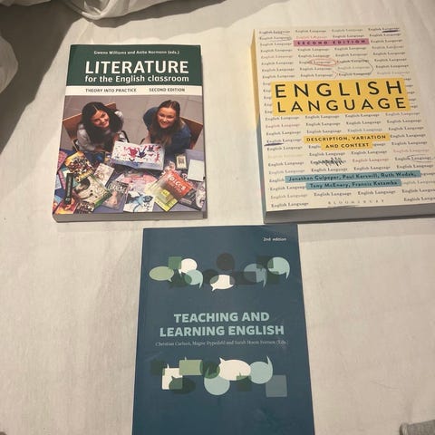 Jeg selger en rekke bøker benyttet under utdanning ved Universitetet i Bergen. Bøkene er pensumbøker fra tidligere bachelor og mastergrad i engelsk/amerikansk litteratur samt noe lingvistikk, i tillegg til noen bøker fra pedagogikkutdannelse. Kanskje trenger du noen av disse til ditt studium, eller de kan være kjekk å ha på hyllen til andre anledninger? Se kommentarer under hvert bilde for pris og tilstand.