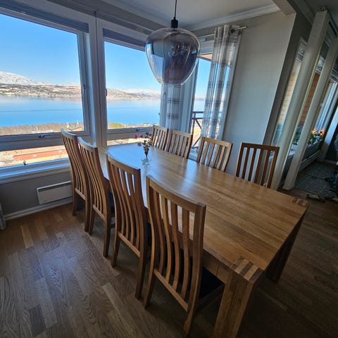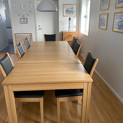 Pent spisebord med 6 stoler i tidløs farve. Selges da det ikke er bruk for det. Det er heller ikke brukt annet enn det bildene viser. Stolene er aldri brukt.