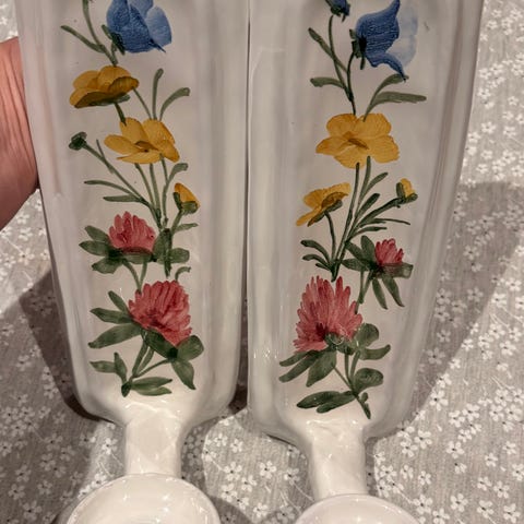 1) Signert Svein. Lysestakepar, blå med gull. Noe avslag nederst, men det passer egentlig greit til utrykket synes jeg! 19,5 høye.